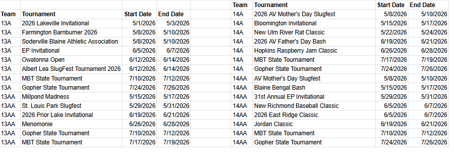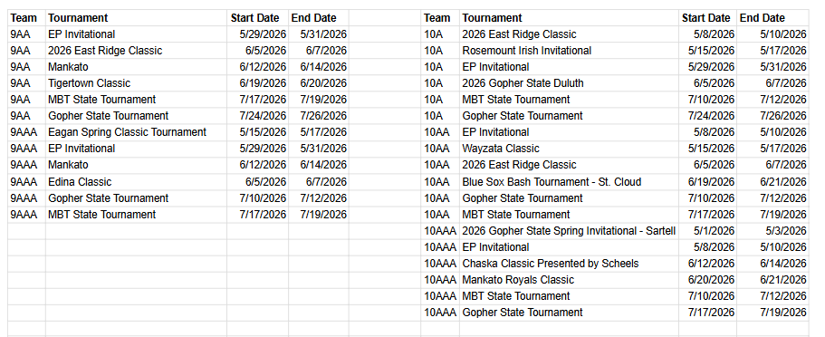 - One of the metro-area tournaments will be our Eden Prairie-hosted tournament for 10U, 11U, 12U, and 15U teams.